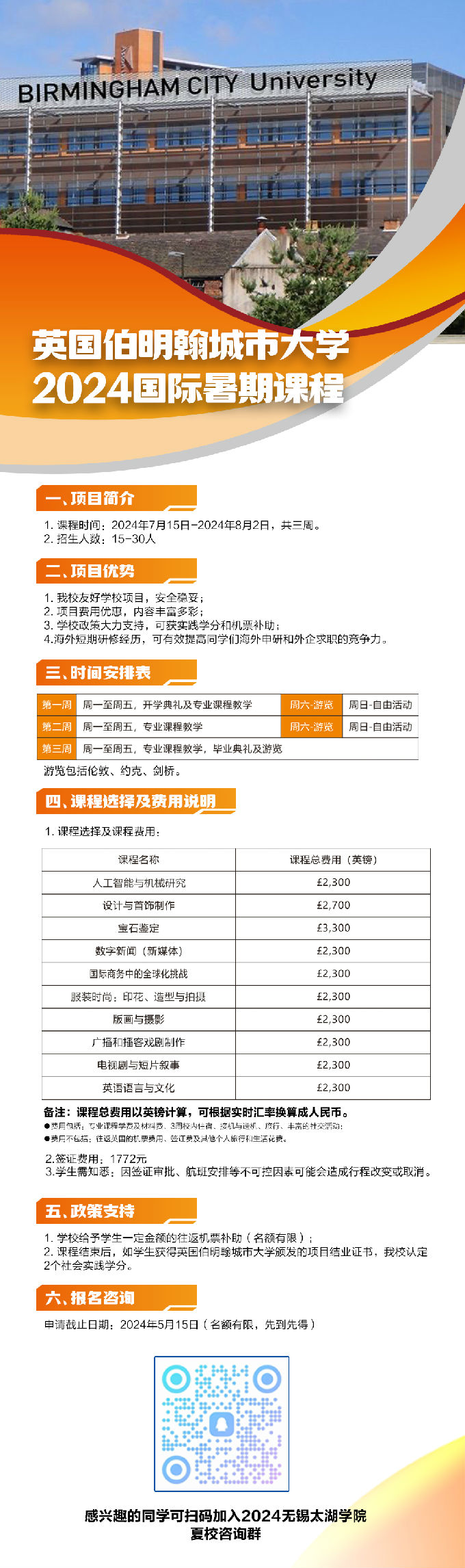 感兴趣的同学可扫码加入2024无锡太湖学院夏校咨询群,进行详细了解!!!